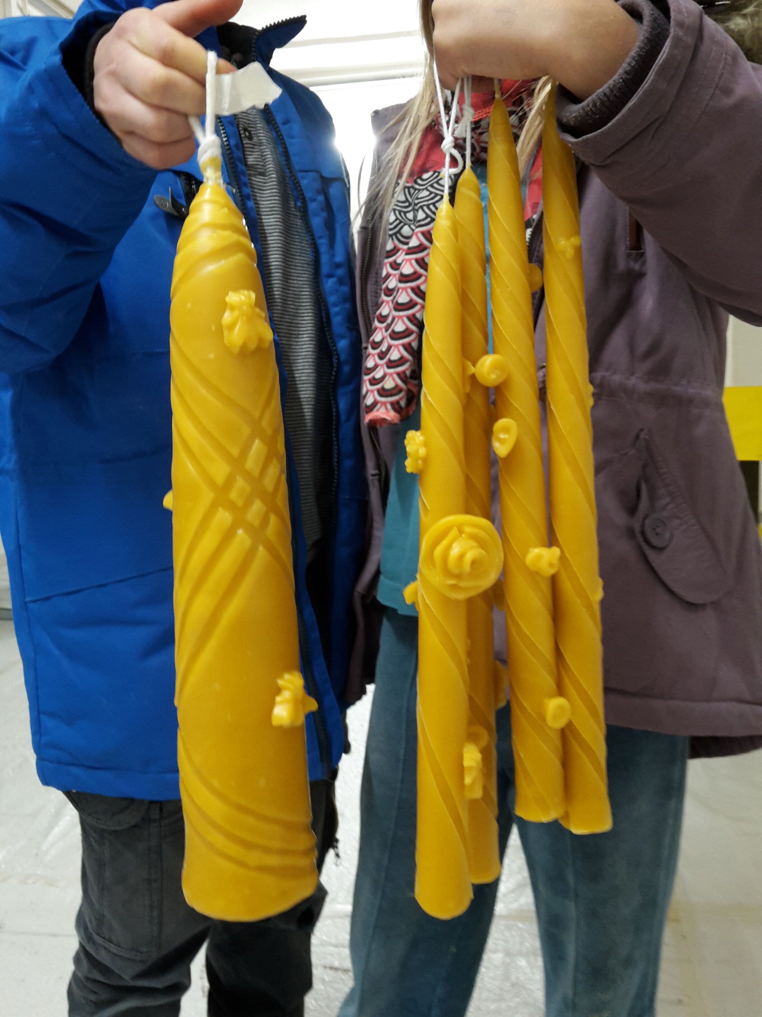 Viele Familien genossen zusammen kreative Zeit bei Bienenwachsduft. Es ist jedes Jahr wieder erstaunlich zu sehen, wie mit viel Fantasie und Kreativität unzählige hübsche, dekorative, verrückte, elegante oder auch extra dicke Kerzen und Bienenwachsdekorationen geschaffen werden.