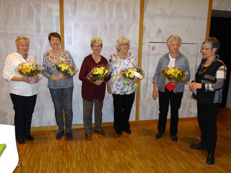 Eve Maurer für 10 Jahre Einsatz in der Strickgruppe, Blanca Odermatt und Christine Schlegel für 10 Jahre Tätigkeit in der Brockenstube, Ursi Feusi für 20 Jahre Treff 60 plus sowie Liselotte Müller für 20 Jahre Leitung der Strickgruppe, Gisela Berg mit 20 Jahren aktive Mitgliedschaft in der Strickgruppe und Hedy Kübler mit überragenden 30 Jahren Strickgruppen-Mitgliedschaft. Unter grossem Applaus durften die genannten Frauen ihren wohlverdienten Blumenstrauss entgegen nehmen.