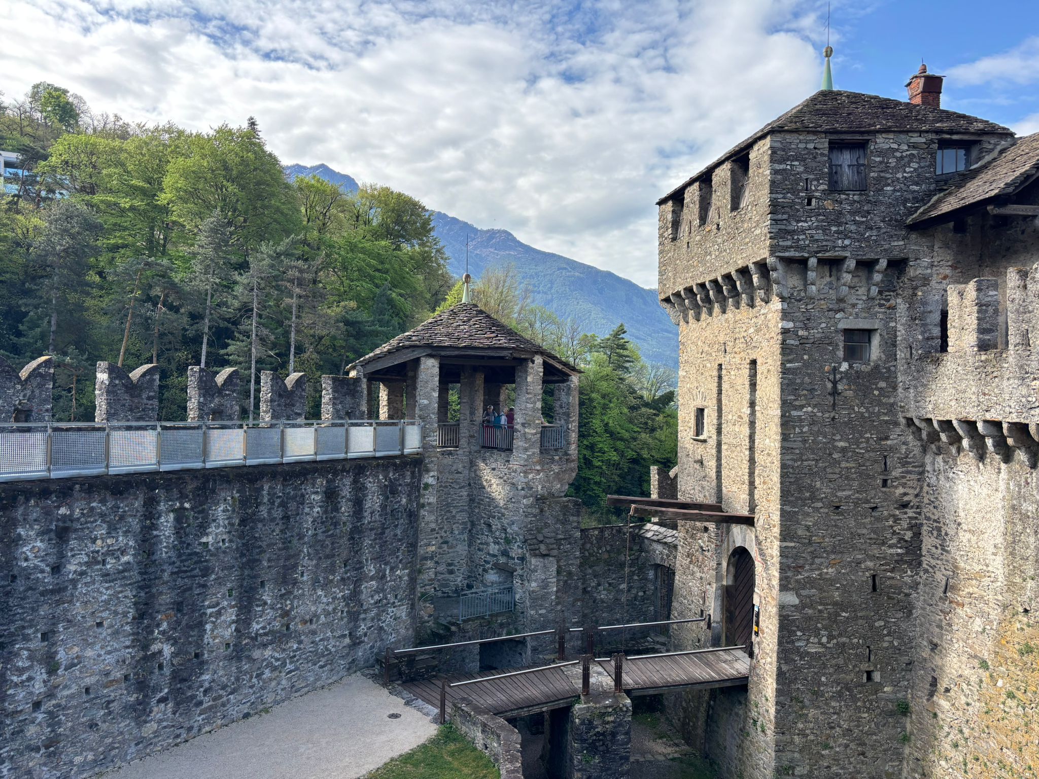 Nach einem gemütlichen Kaffee direkt gegenüber dem Bahnhof beginnt die Wanderung in Bellinzona. Schon nach wenigen Minuten erhebt sich die erste Burg über den Dächern: Castello di Montebello. Der Weg führt stetig bergauf, teils auf Asphalt, teils auf Naturwegen. Montebello wurde im Mittelalter als zweite Burg der Stadt errichtet und spielte eine zentrale Rolle im Verteidigungssystem. Die massiven Mauern, Zinnen und Türme lassen die damalige strategische Bedeutung eindrücklich spüren.
