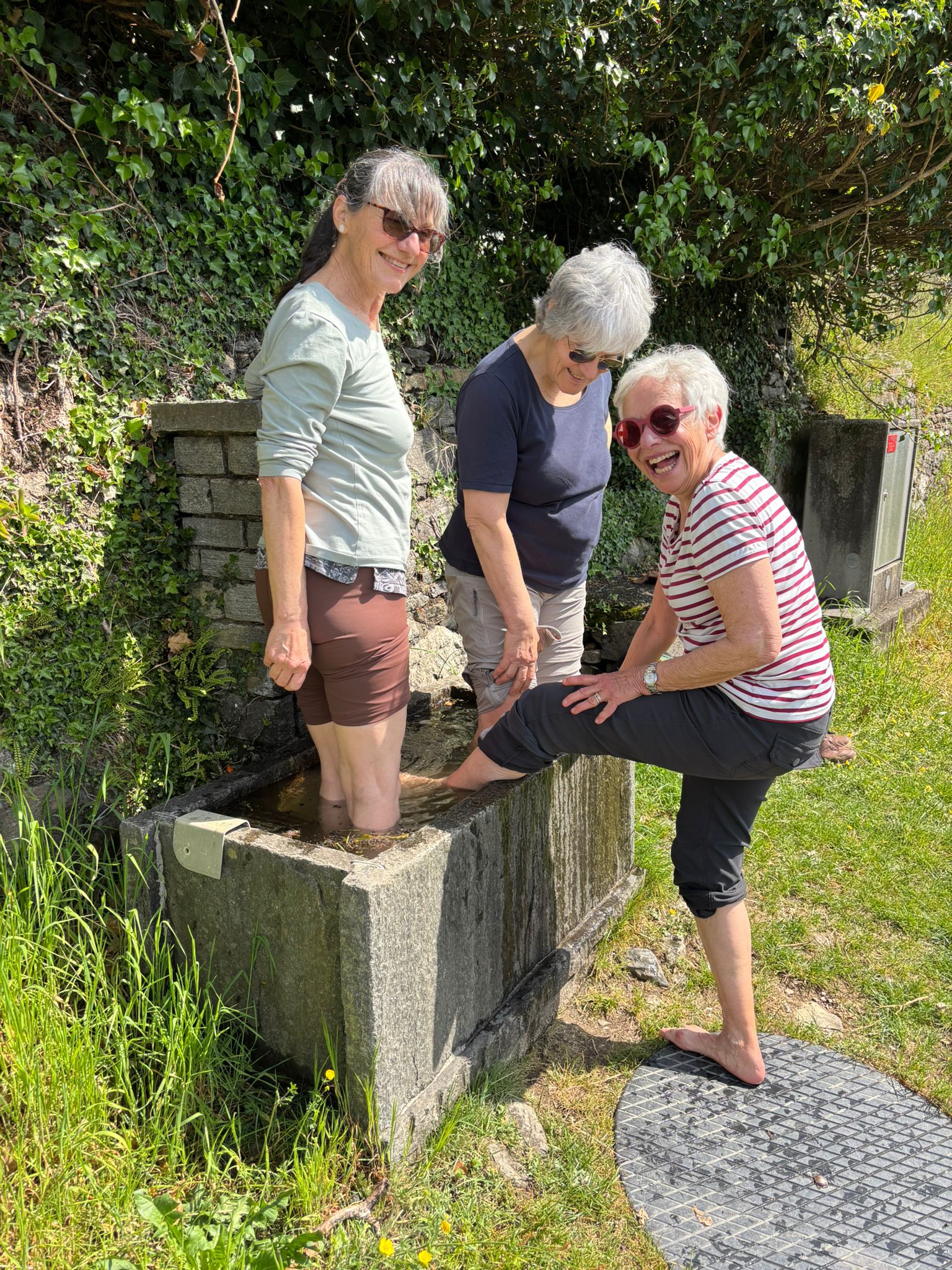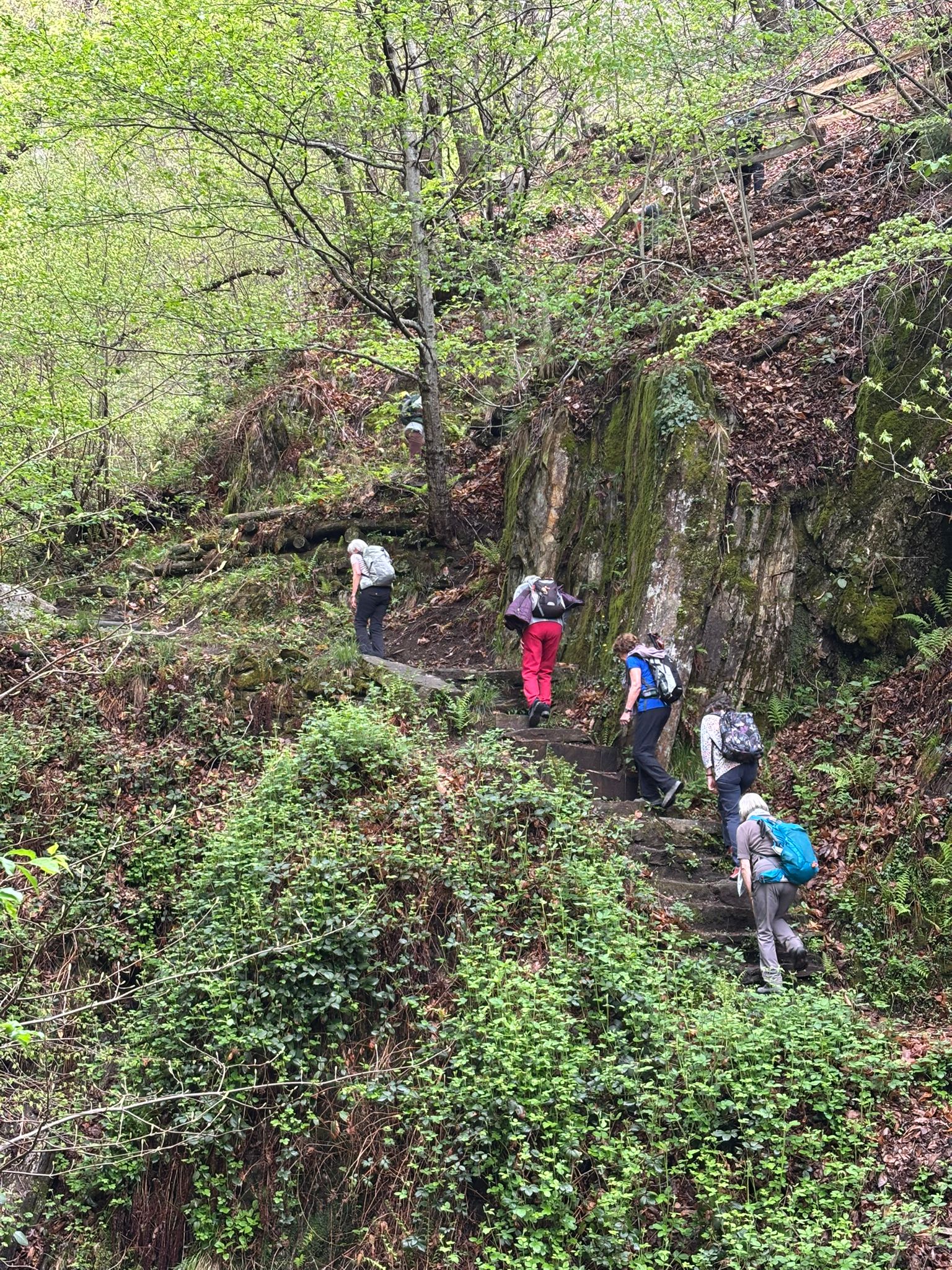 Auf dem Abstieg Richtung letzte Burg wurden wir vom warmen Frühlingswetter begleitet. An einem kleinen Brunnen konnten wir nicht widerstehen: Einige mutige von uns zogen die Schuhe aus und gönnten sich ein erfrischendes Fussbad im kühlen Wasser. Es wurde viel gelacht – ein einfacher, aber unglaublich schöner Moment, der die Wanderung noch einmal besonders gemacht hat.