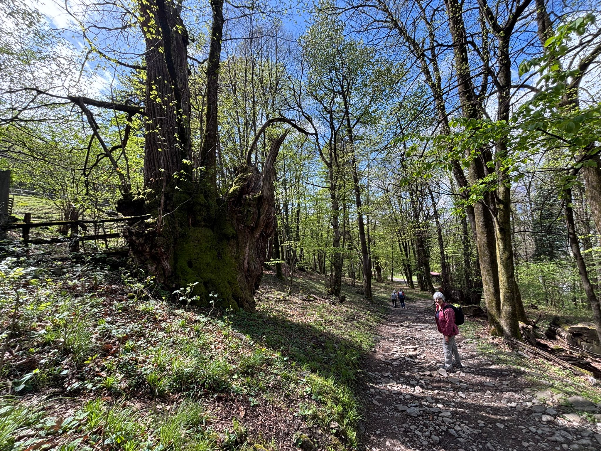 Nach der Besichtigung geht es weiter durch Wälder und über schmale Pfade. Hier zeigt sich die Wanderung von ihrer ruhigeren Seite: moosbedeckte Steine, verwurzelte Wege und immer wieder kleine Brücken über Bäche. Besonders faszinierend sind die uralten Bäume entlang des Weges. Einige von ihnen wirken wie mehrere hundert Jahre alt – mit dicken, gedrehten Stämmen, tiefen Rissen in der Rinde und teilweise hohlen Innenräumen. Moos überzieht ihre Oberfläche wie ein grüner Teppich, und man hat fast das Gefühl, sie hätten Geschichten aus längst vergangenen Zeiten gespeichert.