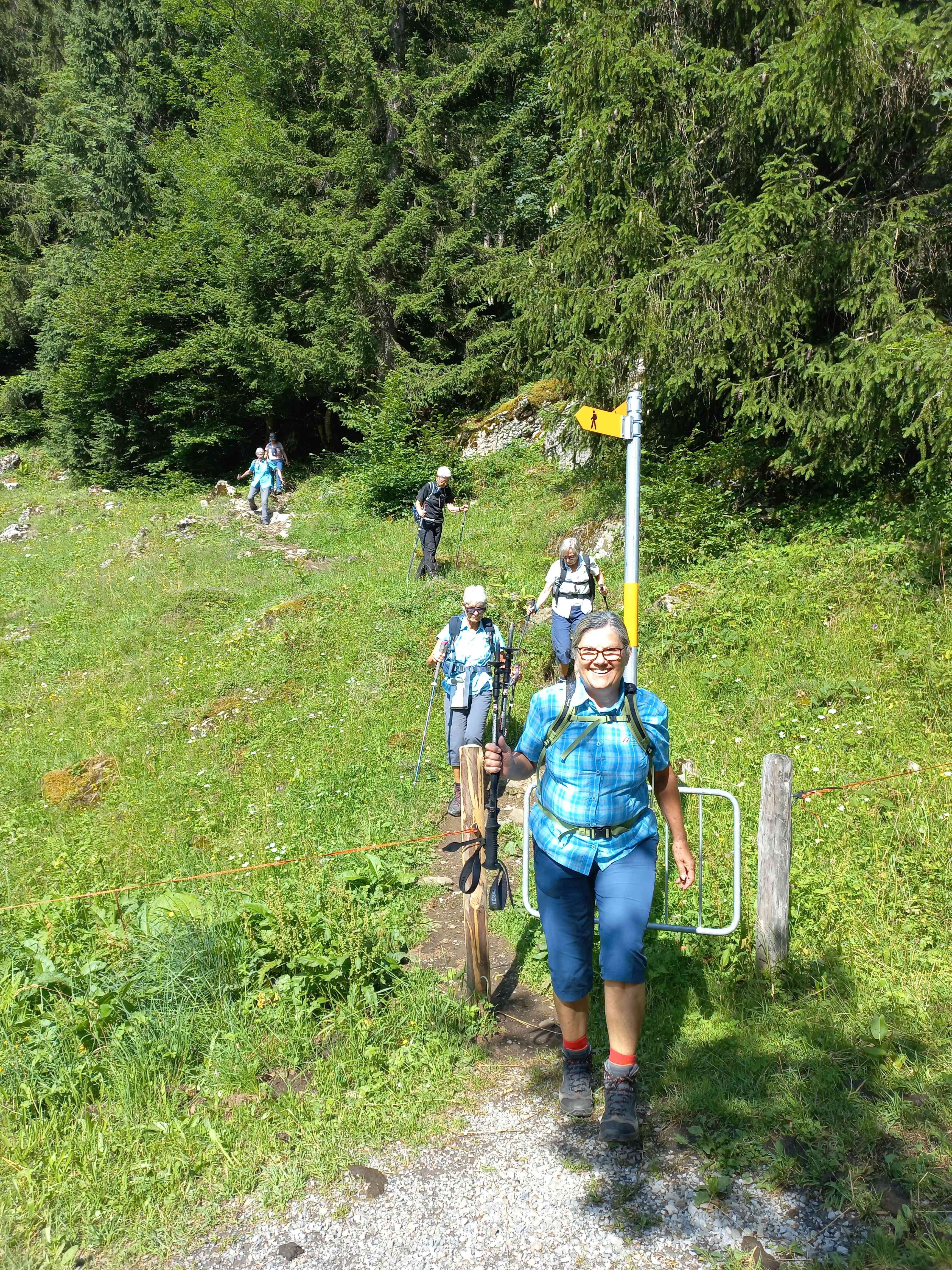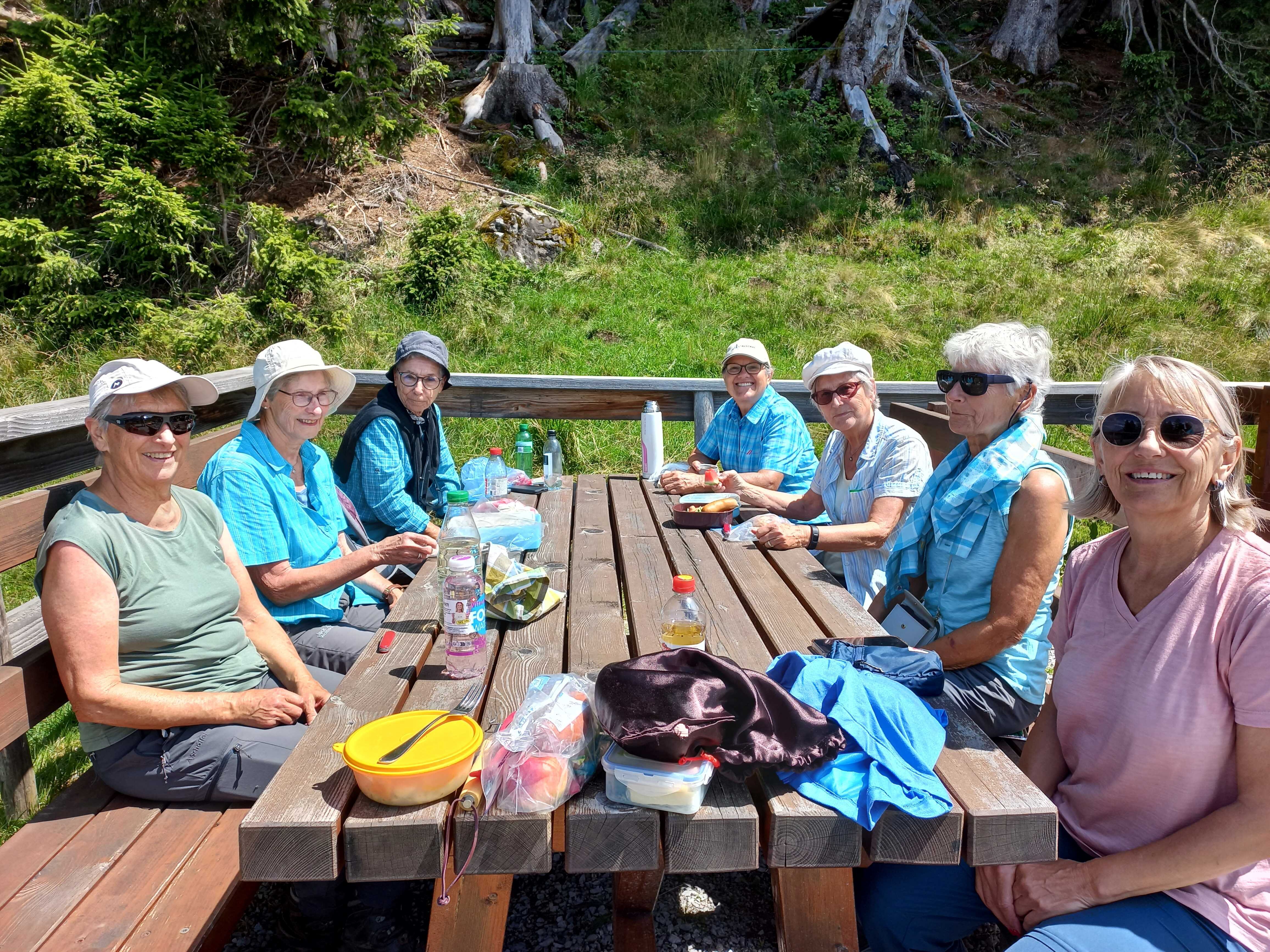 Entweder über den Sattel, oder rund um den „Berg“ zur Grillstelle Sattelboden. Die Sattel-Gruppe macht sich auf den Wald-Wiesenweg, der nicht mehr offiziell unterhalten wird. Die Weiden mit Viehtrampen. Gleichgewichtsübungen sind automatisch eingebaut. Vor dem Sattelboden werden wir mit feinem Rauchduft empfangen. Jetzt die Wurst auf den Rost und schon bald sind alle zusammen am Geniessen.