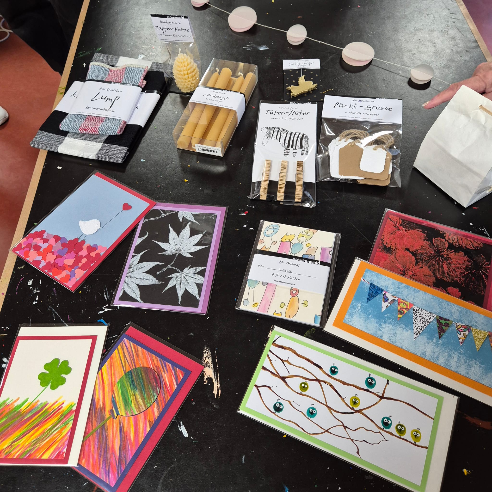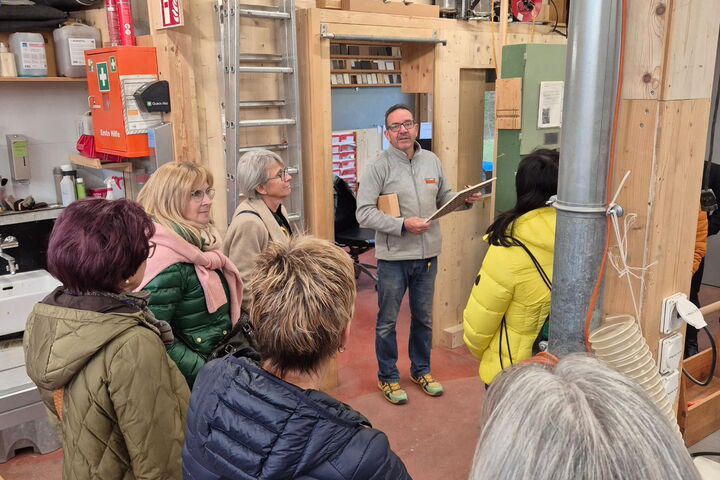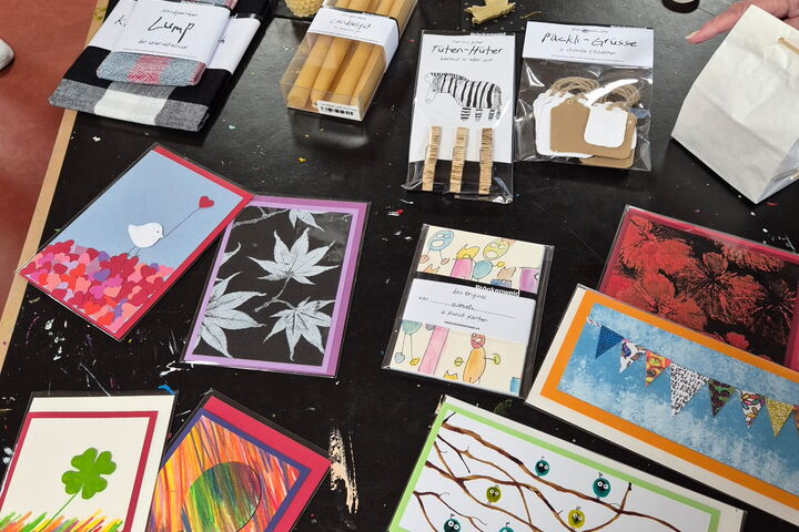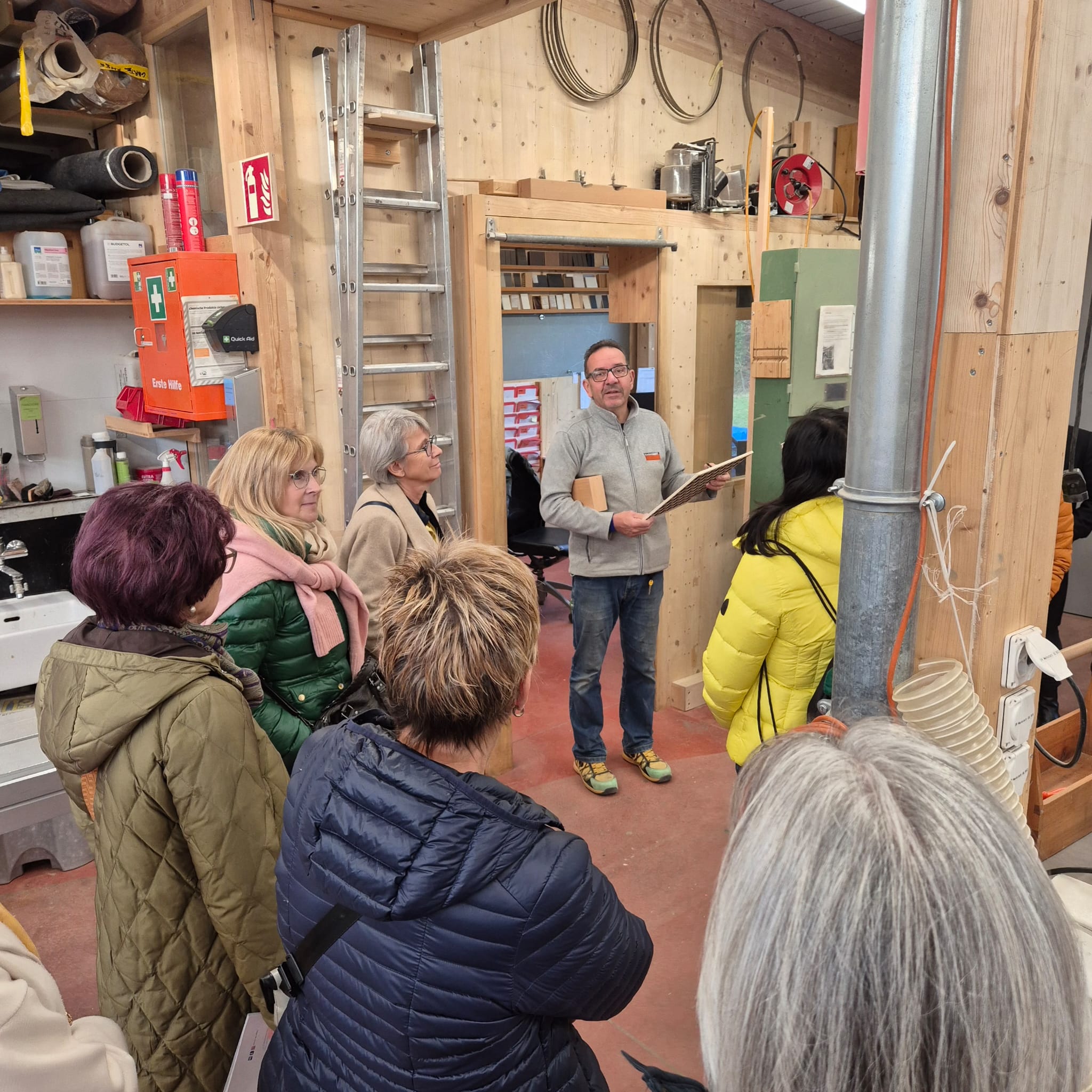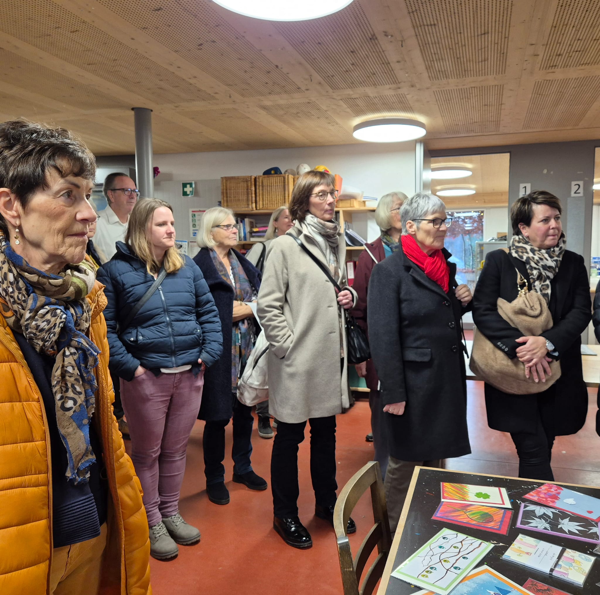 Wir dürfen eine Wohngruppe besichtigen und das Gewächshaus bestaunen. Dieses liefert nicht nur Gemüse für den Eigenbedarf, sondern es wird auch auf diversen Wochenmärkten zwischen Meilen und Rüti verkauft. In der Floristik werden derzeit mit Hochdruck Adventgestecke produziert, die im Weihnachtszelt verkauft werden oder von Privatpersonen bestellt wurden. Spannend ist auch die Schreinerei. Diese produziert verschiedenste Auftragsarbeiten für Bauunternehmen, Firmen und Privatpersonen, wie z.B. Poolabdeckungen, Badezimmerunterschränke, Geschicklichkeitsspiele und vieles mehr. Auch das Atelier, in dem kunstvolle Karten, Bilder, selbstgemachtes Papier etc. in vielen kleinen Arbeitsschritten hergestellt werden, begeistert uns sehr. Anschaulich wird beschrieben, wie eine Karte von bis zu neun Personen gefertigt werden, immer im Hinblick auf die Fähigkeiten der jeweiligen Personen. In allen Abteilungen spürt man, wie auf die Bedürfnisse der Mitarbeiter Rücksicht genommen wird, wie man fördern möchte, ohne zu fordern und wie herzlich alle miteinander umgehen.