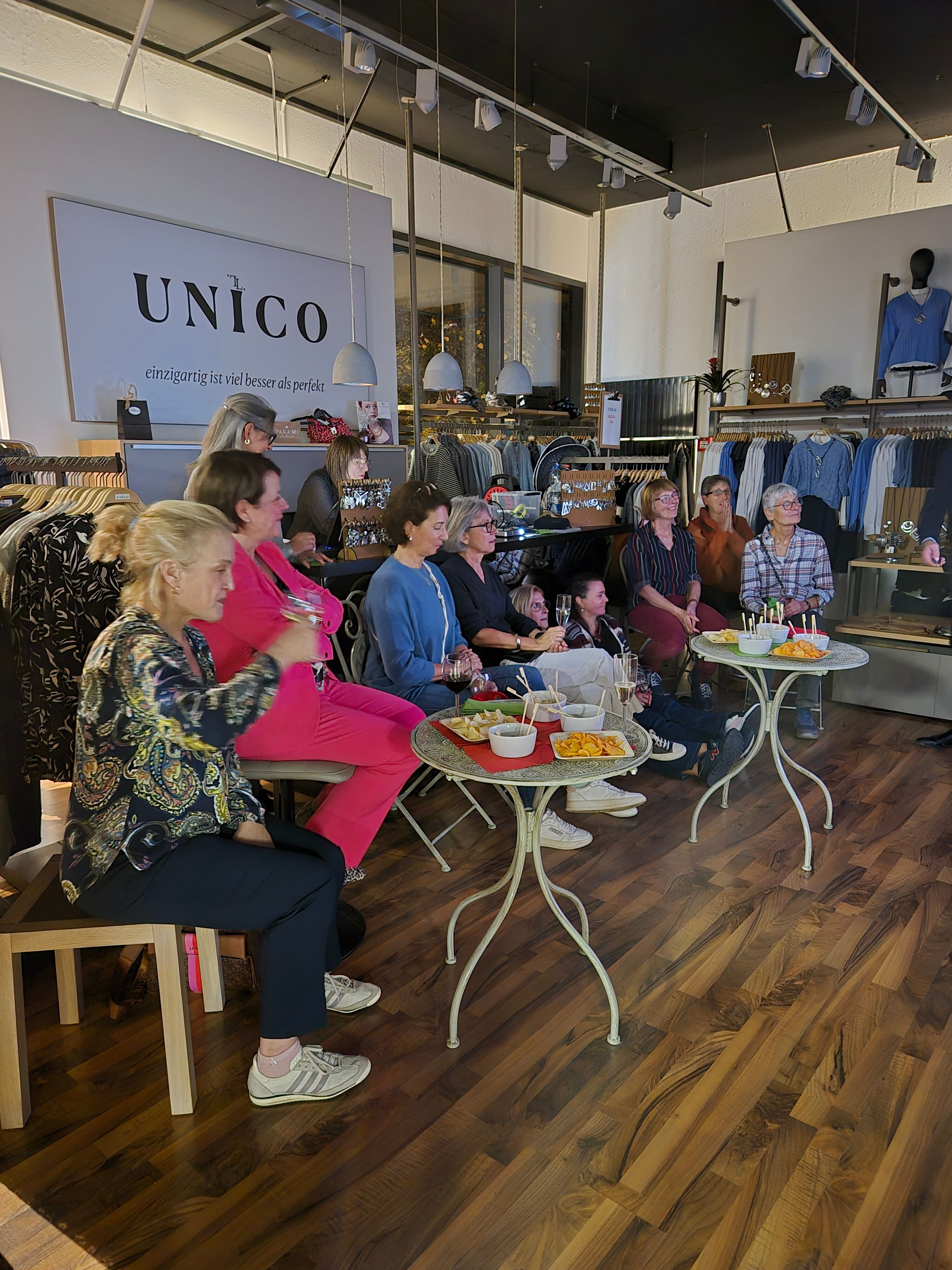 Der Abend voller Stil und Mode fand bei Unico (ehemals Esprit) in Männedorf statt. Nach einer kurzen Vorstellung des Männedörflers Christian Linciano, der sich auf Farb- und Stilberatungen spezialisiert hat, und Lina, der Besitzerin von Unico, wurden wir nach einem feinen Apero von Il Peperone durch die Regeln von Knigge geführt und es wurden die einzelnen Farbtypen anschaulich und unterhaltsam erklärt.