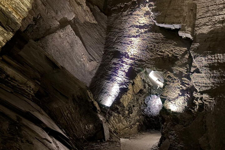 Dann geht es weiter in den Landesplattenberg, in dem uns Hansjürg Streiff von der Stiftung Pro Elm in der zweiten Führung des Tages alles rund um den Abbau des «schwarzen Golds vom Sernftal» zeigt. Wir steigen ein in die Tiefen der Stollens, welche – solange die Lichtinstallationen eingeschaltet sind – gar nicht so unheimlich wirken. Doch sobald es dunkel ist, lässt sich erahnen, welch harte Arbeitsbedingungen damals für die Bergarbeiter geherrscht haben müssen. Der Landesplattenberg mit seinen bis zu 30 Meter hohen Kavernen bietet heute einen eindrücklichen Einblick in die Welt des Bergbaus, zeigt Fossilien, die im Schiefer eingeschlossen waren und es finden sogar Konzerte in diesem einzigartigen Ambiente statt.