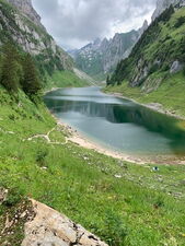 per Bähnli ab Brülisau auf die Alp Sigel – 1 Sonnenhut fährt eine Ehrenrunde – oben Holderesirup und Kaffee im Beggeli – sönd willkom – Wanderung auf und ab mit und ohne Stöhnen – herrliche Blumenpracht in allen Farben: rosa, violett, rot, orange, gelb, blau; Alpenrose, Feuerlilie, Enzian, Skabiosa, Teufelskralle, Braunklee, Fingerhut, Margrite, Glockenblume, Knabenkraut etc. – bis zur Bogattenlücke – Picknick mit Dohlen – dann steil hinunter zum Fählensee – Fussbad mit Fuss-Fisch-Peeling und kurzem Schwumm. Nacht im Berggasthaus Bollewees – gemütliche 3-er-Zimmer – Dusche – feiner Znacht mit Spezialrösti nach Geheimrezept des Chefs – Abend-See-Spaziergang mit Felsen-Spiegelbilder – Gugguruf – Vogelkonzert – Wetterleuchten – Donnergrollen. Total 49 Stockwerke, 10 Kilometer, 17‘000 Schritte