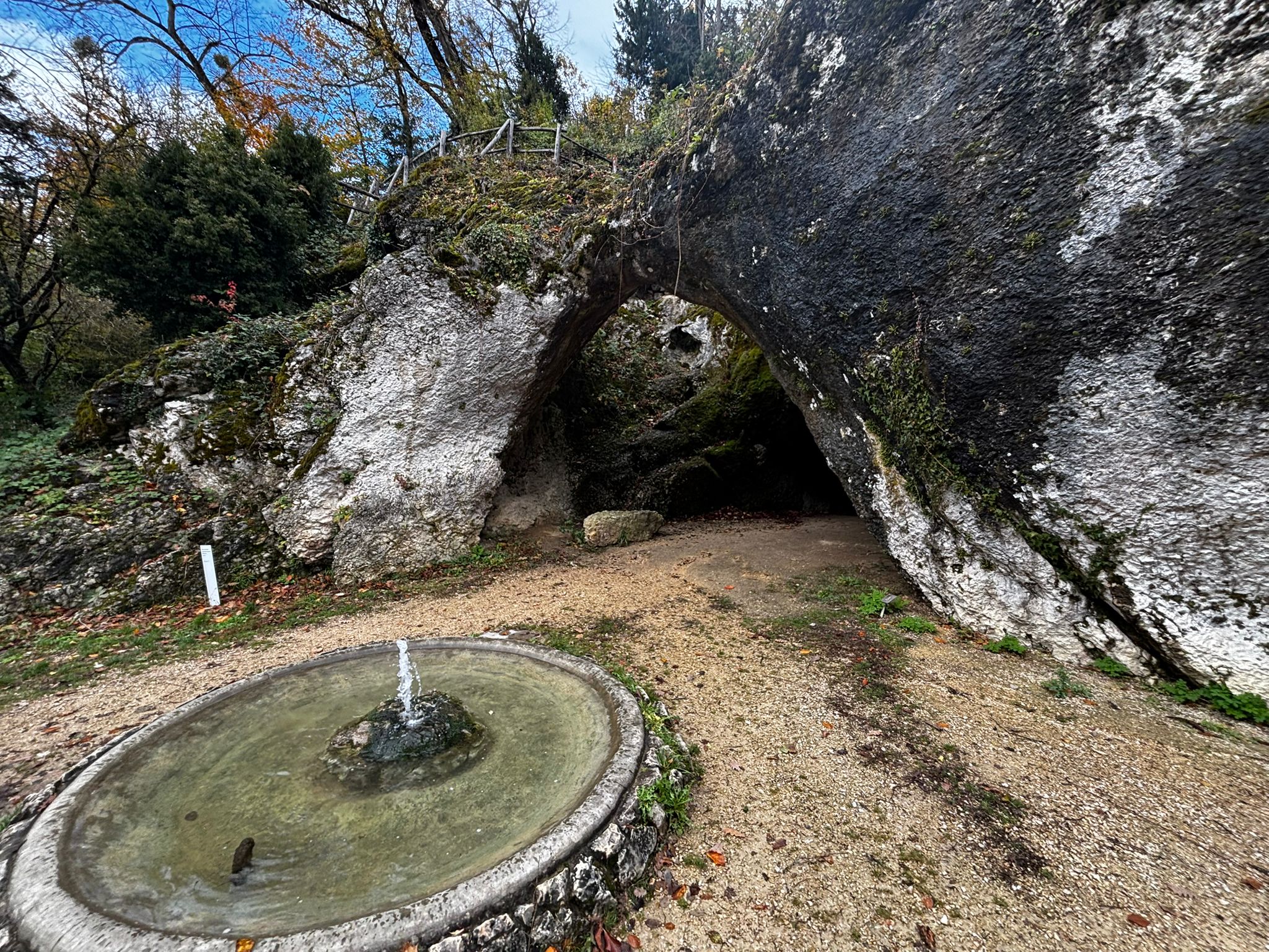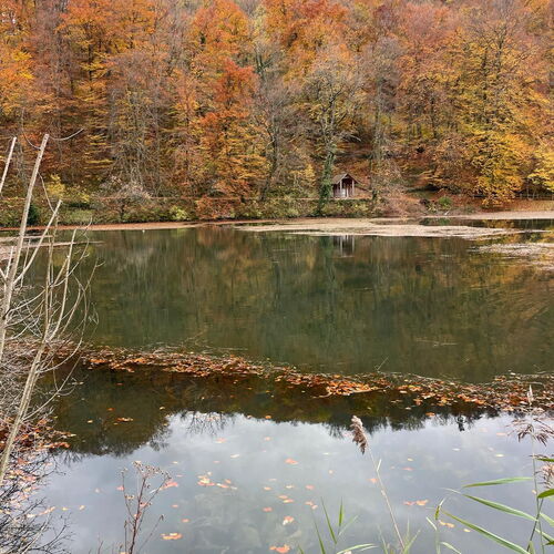 Gestärkt setzten wir unsere Wanderung fort – vorbei an der geheimnisvollen Grotte, der kleinen Waldbruderklause und einem stillen Teich, auf dessen Oberfläche goldene Blätter trieben. Der Weg führte sanft hinunter, auf bequemen Tritten, begleitet vom leisen Rauschen des Bächleins und dem Duft des feuchten Waldes.