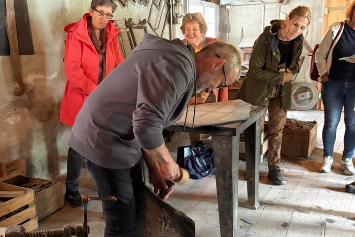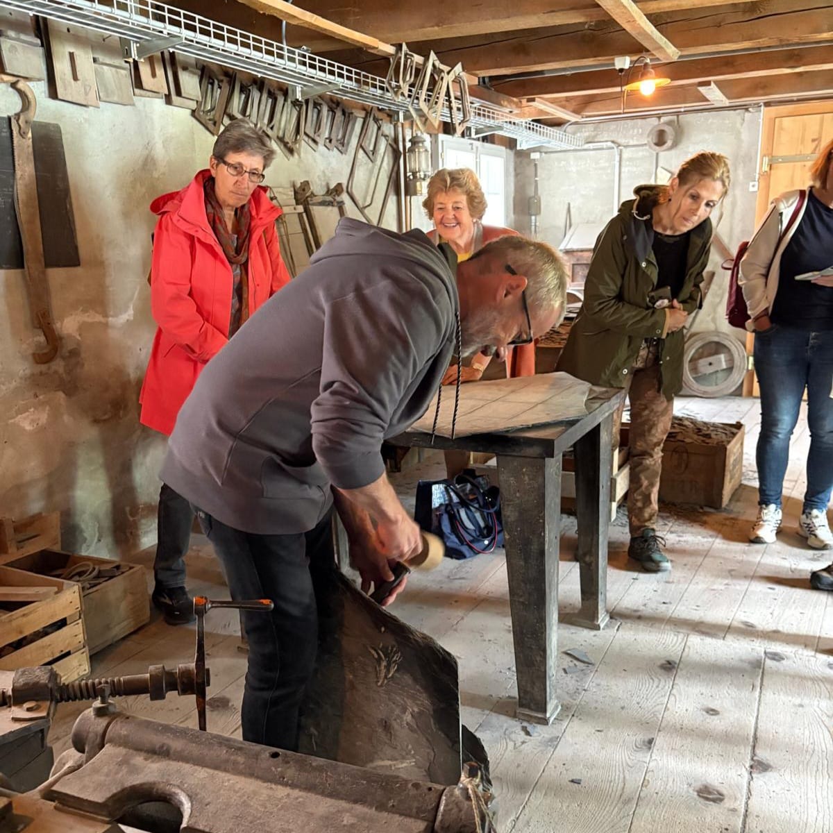 Jürg Schuler, der der Urenkel des Gründers der Schiefertafelfabrik ist, erzählt auf sehr unterhaltsame Art vom harten Alltag der Schiefertafelherstellung, zeigt voller Begeisterung die Geräte, auf die er zusammen mit seiner Familie die Schiefertafeln in 32 einzelnen Arbeitsschritten hergestellt hat und schmückt die Erzählungen mit der einen oder anderen Anekdote über den Erfindungsgeist seines Grossvaters und auch aus seinem eigenen Leben rund um das Schieferhandwerk.