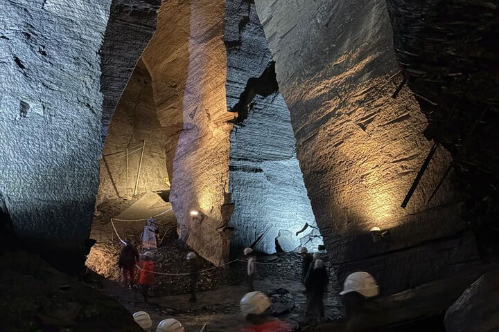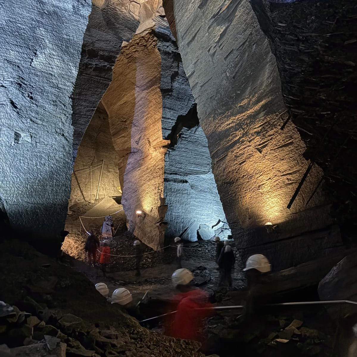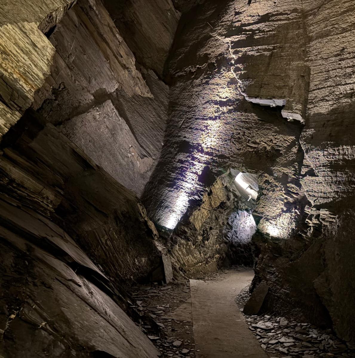Dann geht es weiter in den Landesplattenberg, in dem uns Hansjürg Streiff von der Stiftung Pro Elm in der zweiten Führung des Tages alles rund um den Abbau des «schwarzen Golds vom Sernftal» zeigt. Wir steigen ein in die Tiefen der Stollens, welche – solange die Lichtinstallationen eingeschaltet sind – gar nicht so unheimlich wirken. Doch sobald es dunkel ist, lässt sich erahnen, welch harte Arbeitsbedingungen damals für die Bergarbeiter geherrscht haben müssen. Der Landesplattenberg mit seinen bis zu 30 Meter hohen Kavernen bietet heute einen eindrücklichen Einblick in die Welt des Bergbaus, zeigt Fossilien, die im Schiefer eingeschlossen waren und es finden sogar Konzerte in diesem einzigartigen Ambiente statt.